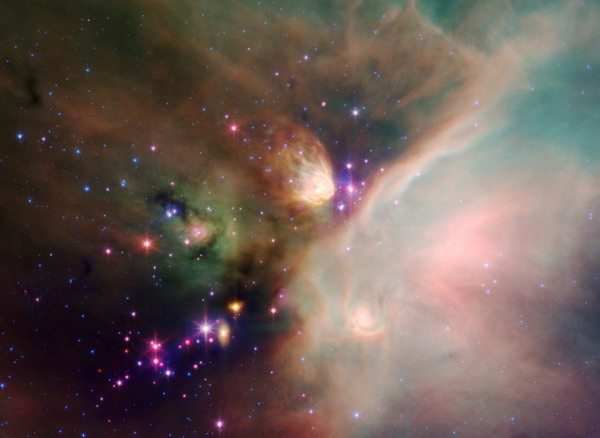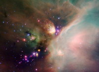 Here is a picture of some baby stars in a nebula. As you can see one side of the nebula is bright, and the other is dark. This is because of the 2 gases. A nebula is what is left behind of a star that has died.