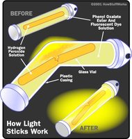 Ever wondered how glow sticks work? I know I have! well its to do with a chemical reaction between hydrogen peroxide and phenyl oxalate ester (scientific gobbledegook). So basically imagine there is the glow stick outer casing,which has hydrogen peroxide in it and a little pill shaped object which contains phenyl oxalate ester.
